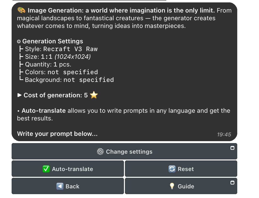 RecraftBot supports auto-translation of requests. You can write in any language — the service will translate them into English, as the model works better in this language.