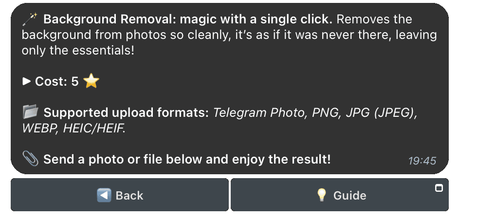 To use the background removal feature, go to the 🪄 Remove Background section in the main menu or enter the /remove_bg command. This will open the image upload page.